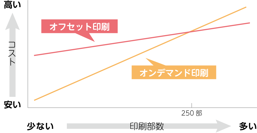 オンデマンド印刷は数10部~数100部程度の小ロットの場合、オフセット印刷よりも費用を抑えやすいため、低価格で少部数の印刷物を作りたい場合に向いています。