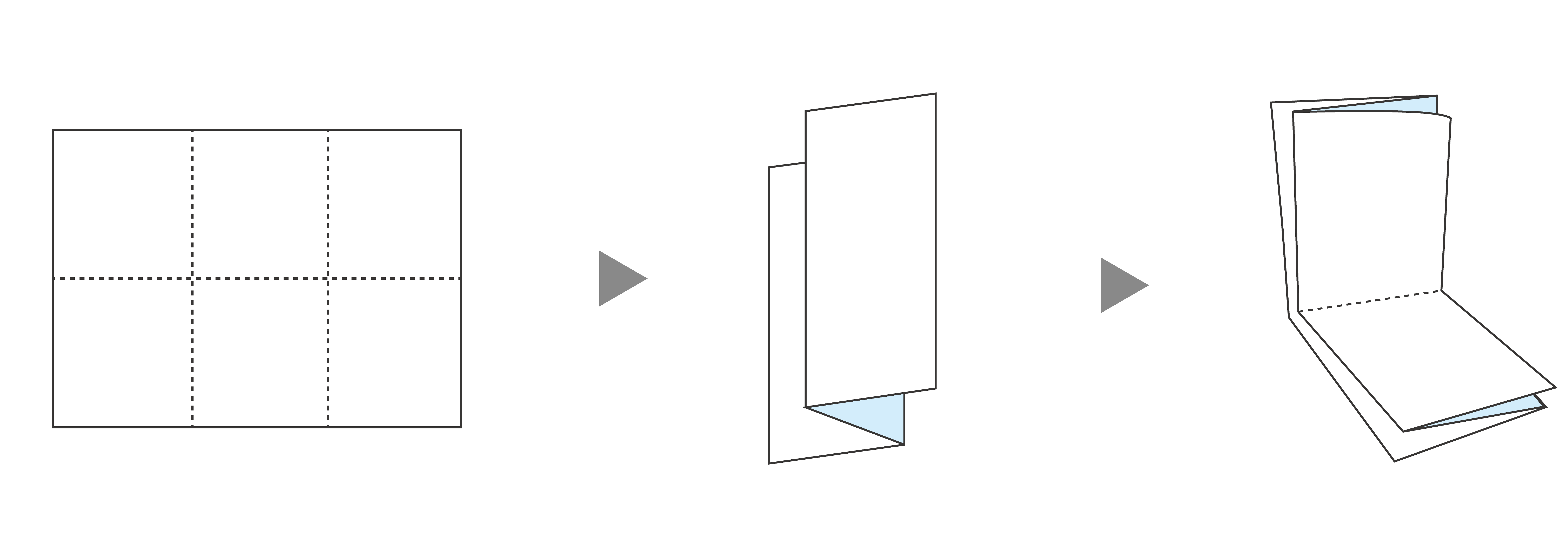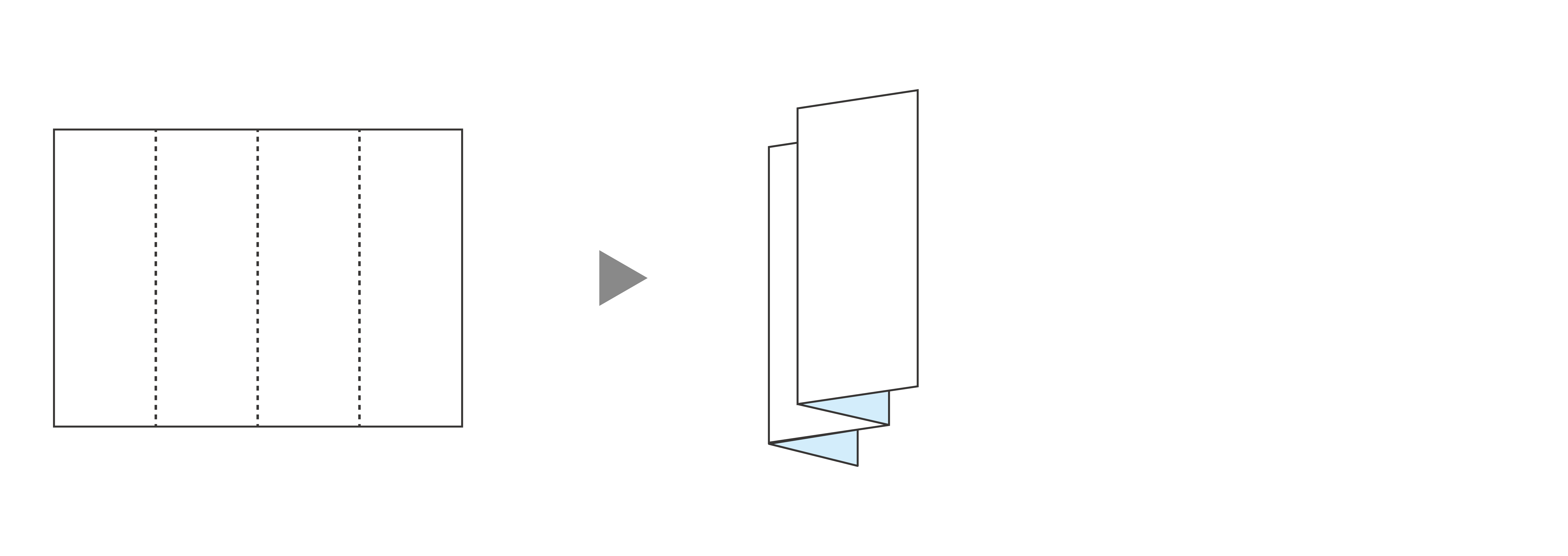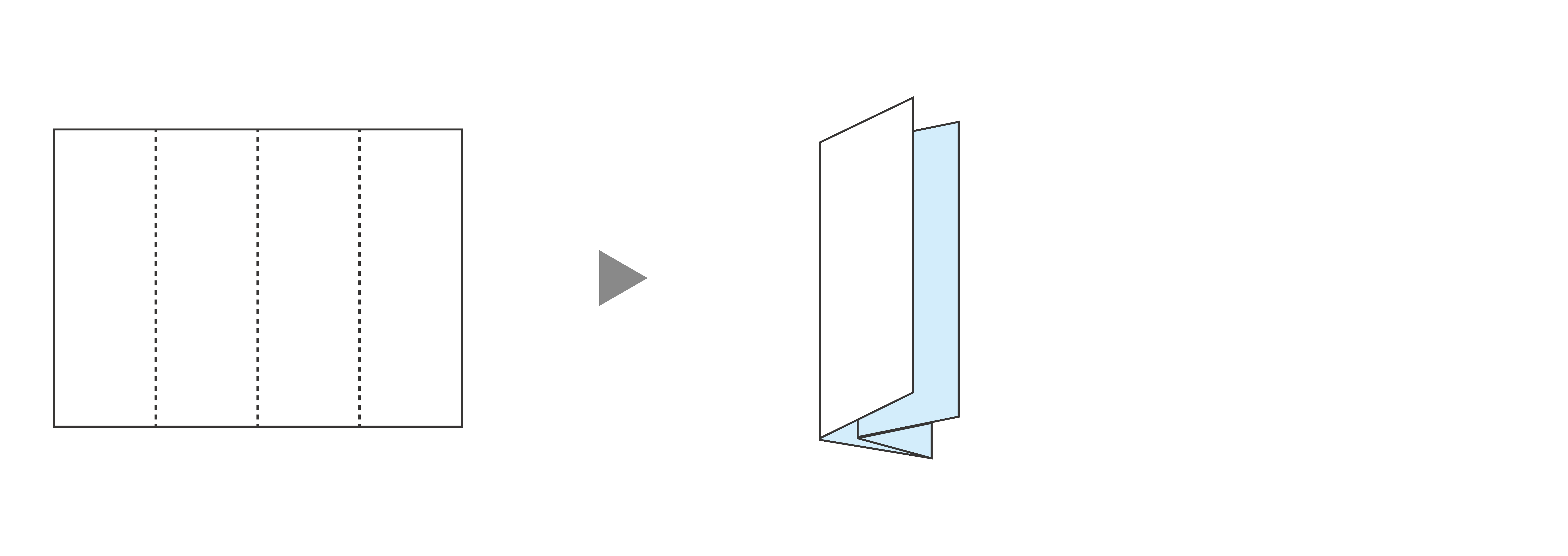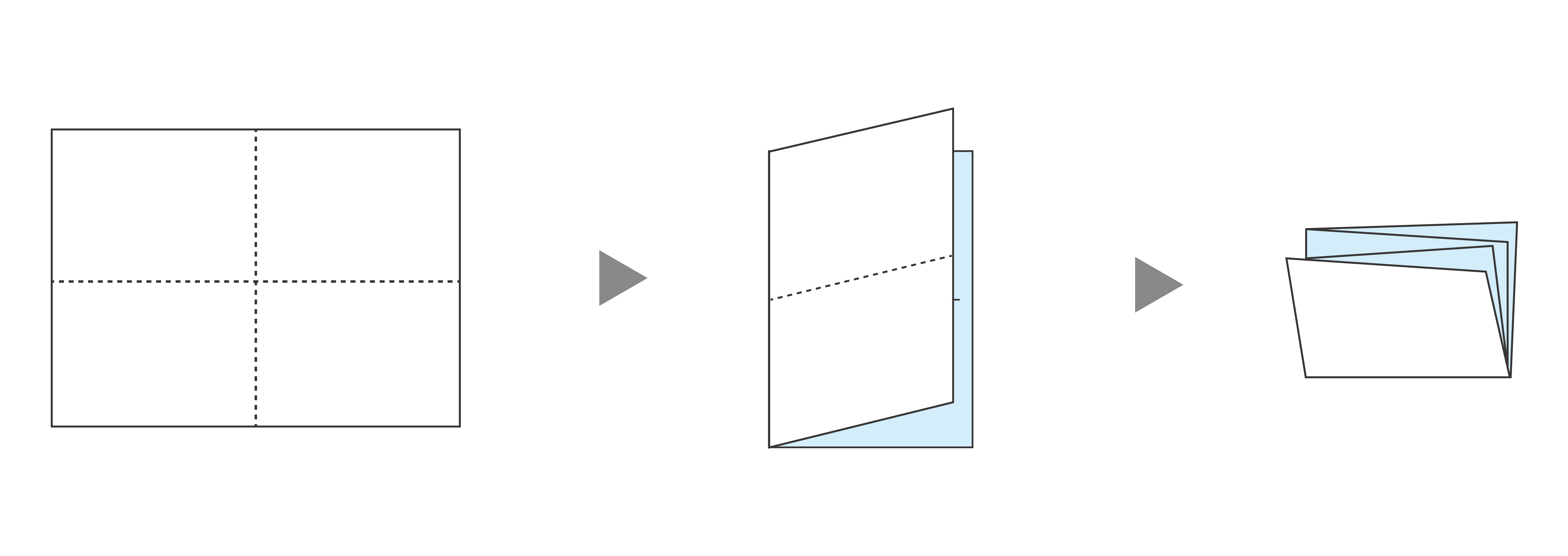 折り加工の中で一番多く使われています。会社案内や新聞折り込みチラシなど、様々な用途でお使いいただけます。