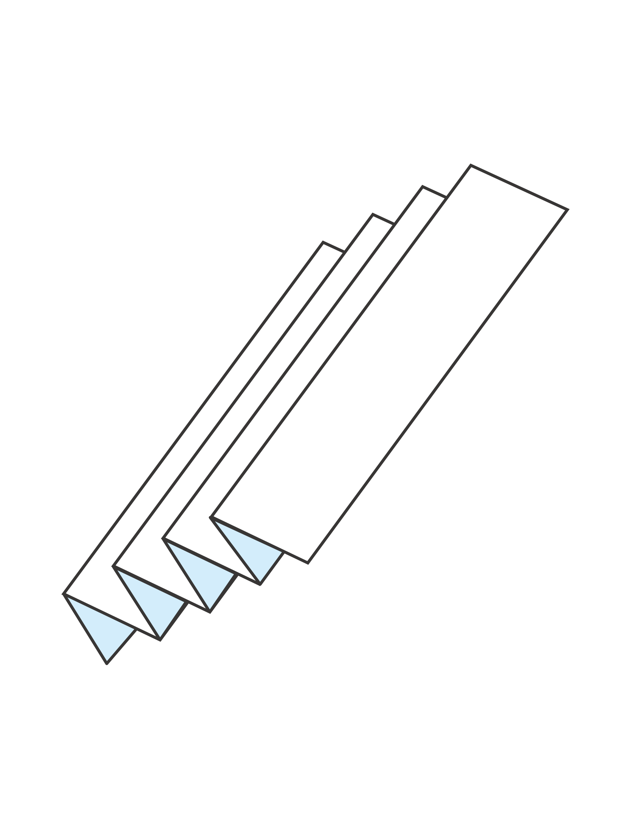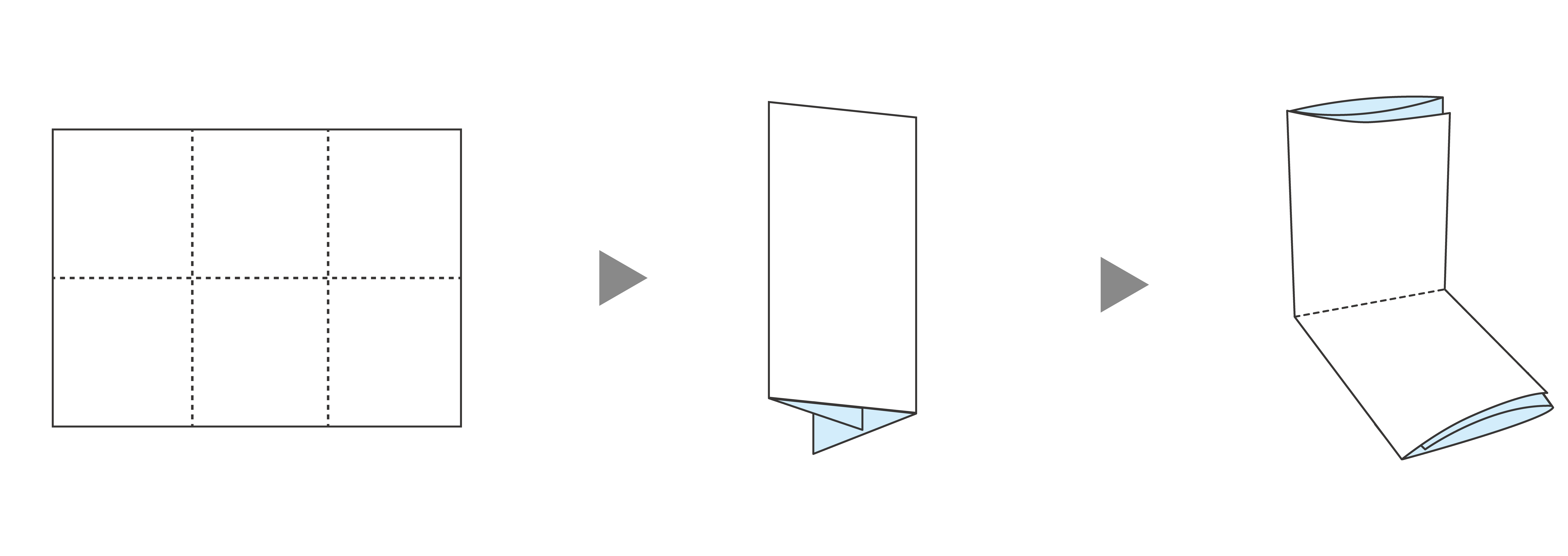 商品カタログやプログラムなど、二つ折りでは紙面が足りない場合に巻き三つ折りを使います。リーフレットやパンフレットなど、様々な用途でお使いいただけます。